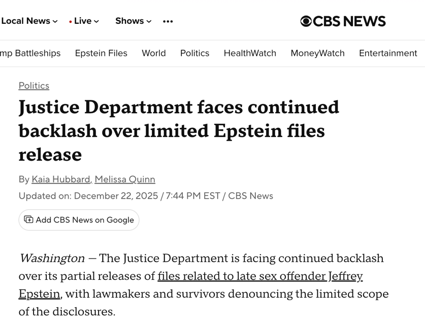 △好意思国哥伦比亚播送公司报谈,王法部因未能弥散公布爱泼斯坦档案而遭到激烈月旦。