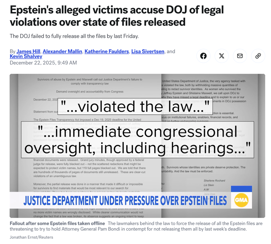 △好意思国世界播送公司(ABC)报谈,爱泼斯坦案受害者指控王法部在公开文献方面违背了干系法律。