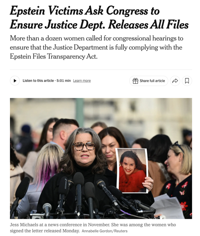 △《纽约时报》报谈,爱泼斯坦案受害者条款王法部公布沿路文献。